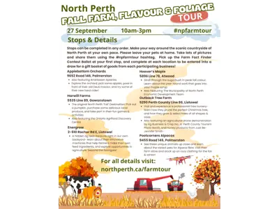 Join us on Saturday, September 27th from 10:00 a.m. to 3:00 p.m., for a FREE self guided tour around the beautiful countryside of North Perth. Experience the beautiful fall colours, sample the delicious products, and learn about the exciting variety of farms and agricultural businesses right here in North Perth!